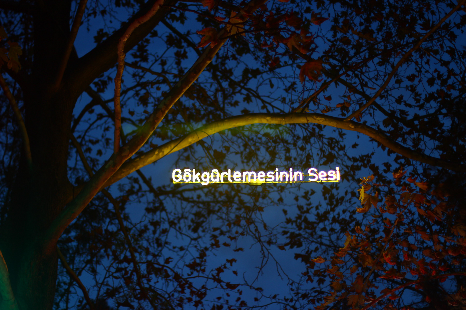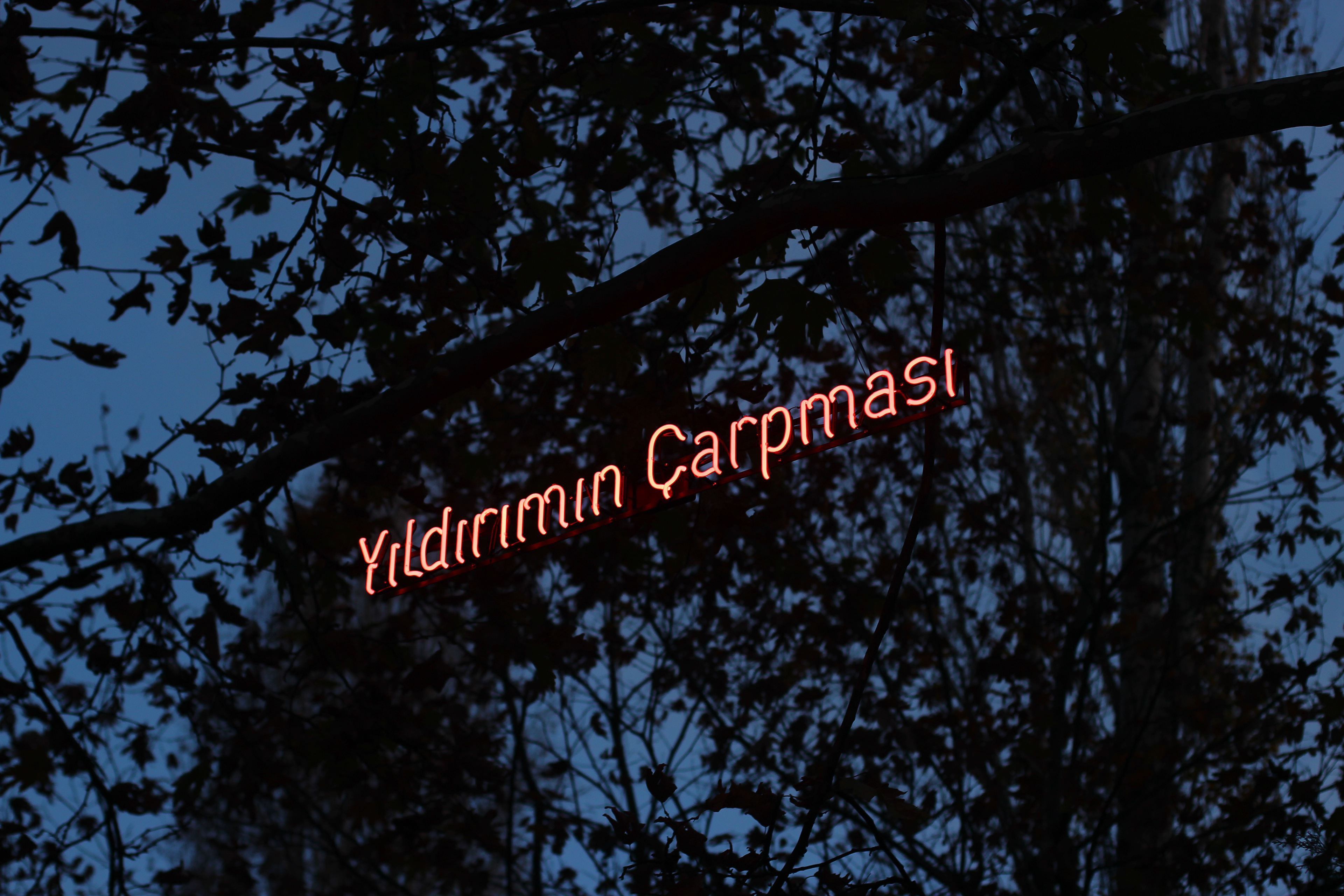 which the following phrases are written using neon lights on the branches of a tree in the Park of Seğmenler:
